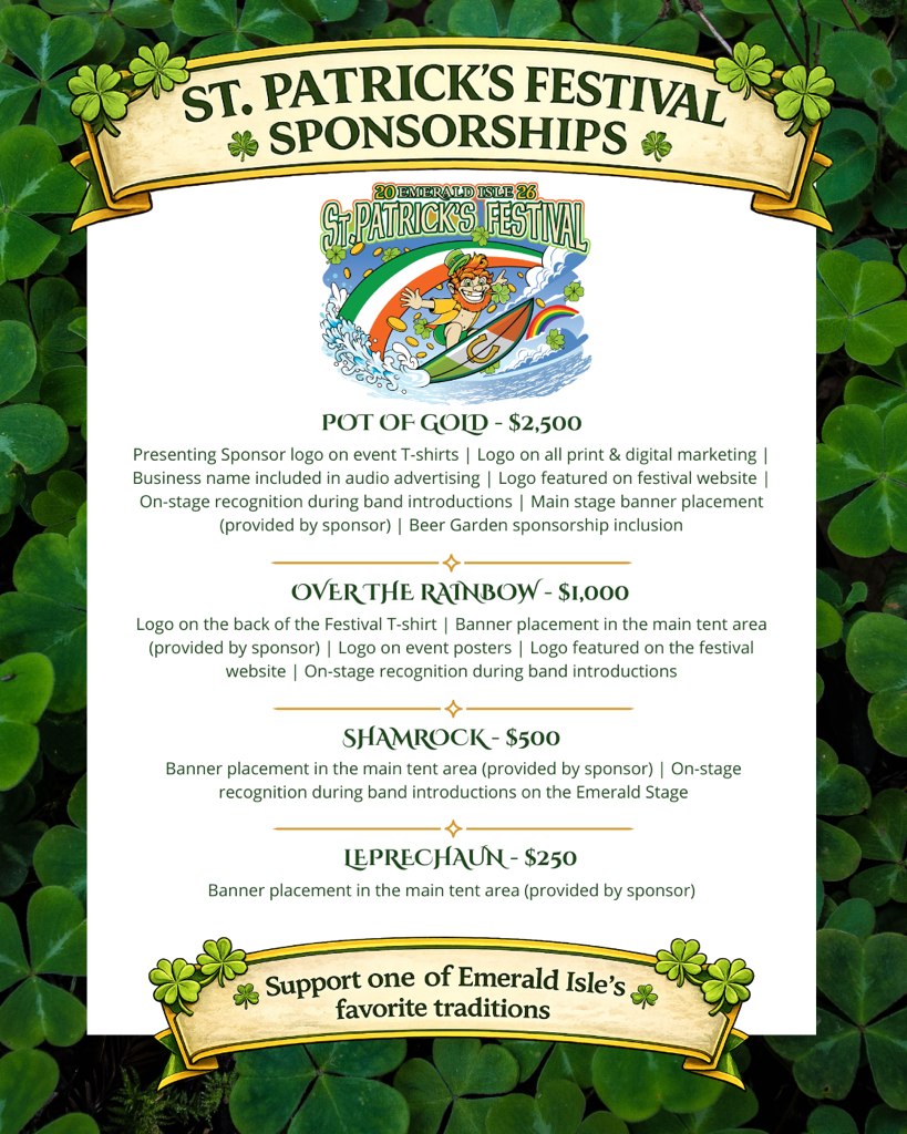 Sponsorships are officially OPEN for the St. Patrick’s Day Festival, and we are excited to invite our local businesses and community partners to be part of one of Emerald Isle’s favorite traditions.